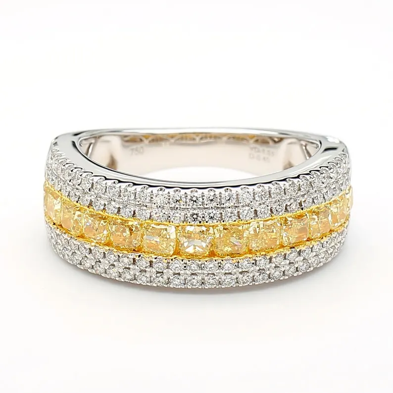 Surrounding the centerpiece are Natural round white diamonds, offering a sparkling contrast that enhances the richness of the yellow diamond. With a superb G color grade and VS2 clarity, the diamonds in this piece deliver unmatched beauty and clarity.
