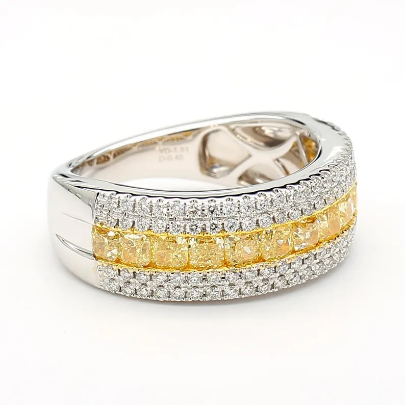 A radiant 1.95 carat cocktail ring in 18K gold featuring a cushion cut Natural yellow diamond and brilliant round white diamonds. Elegance meets ethical luxury.
