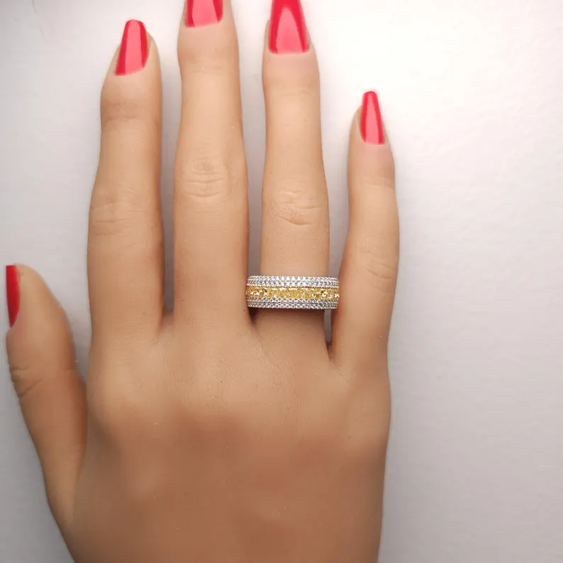 A stunning 3.21ct total weight cocktail ring in 18K solid gold, centered with a 2.06ct radiant-cut yellow lab grown diamond and flanked by half-moon and round white diamonds. Ethically crafted and IGI certified.