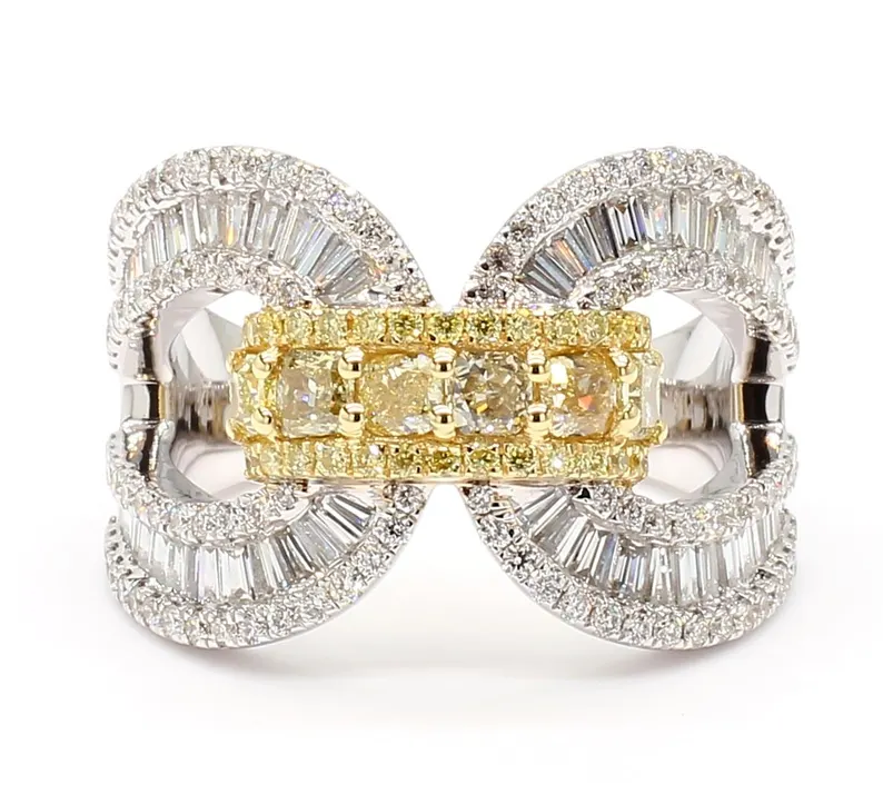 A luxurious 2.11 carat cocktail band in 18K gold, featuring radiant and cushion cut yellow diamonds with baguette and round white diamond accents. Ethically crafted, GIA certified.