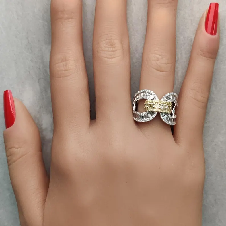 The vibrant yellow stones are beautifully complemented by a combination of Natural white diamonds in baguette and round cuts, adding refined sparkle and geometric elegance. Every diamond is VS2 clarity and G color, promising excellent brilliance and eye-clean perfection.