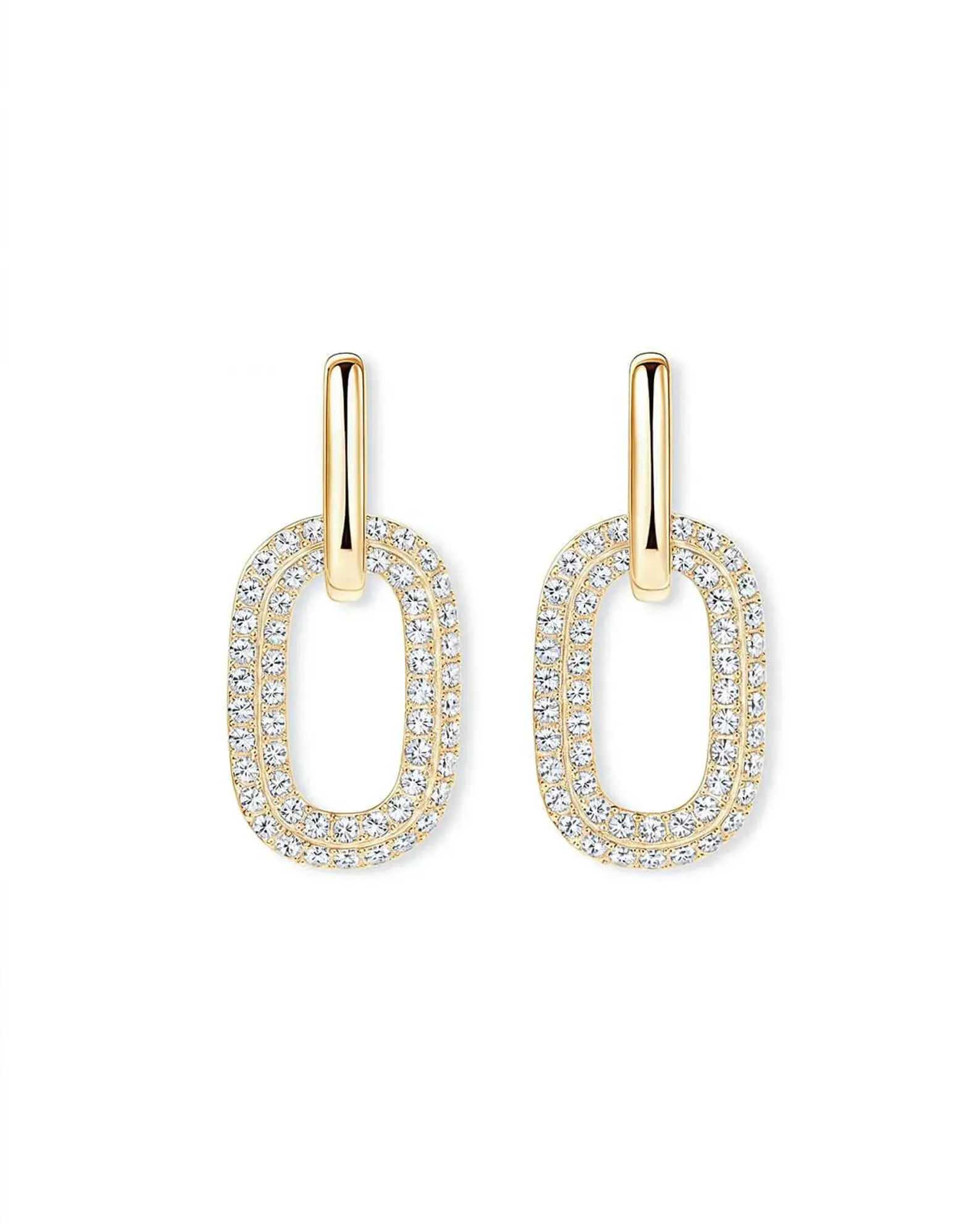 The design highlights two interlinked oval drops, gracefully dangling at 23mm (0.9″) length and 15mm (0.59″) width, giving the earrings a radiant flow that catches the light from every angle. Crafted in 18K solid gold, the double oval silhouette blends timeless elegance with contemporary charm, making them a perfect choice for special occasions, weddings, or evening wear.