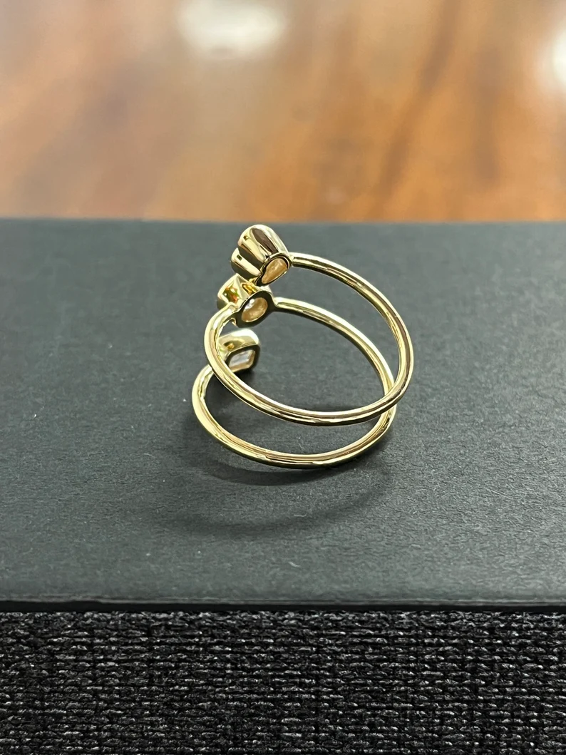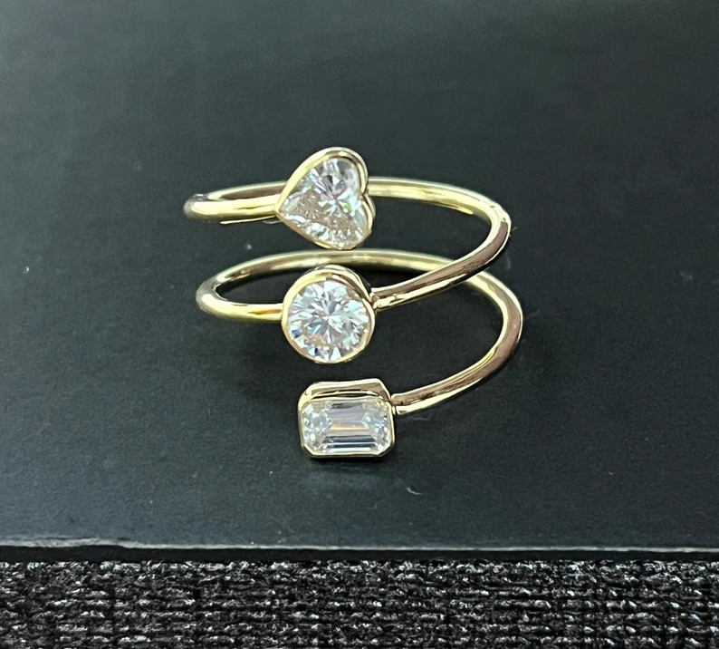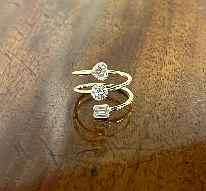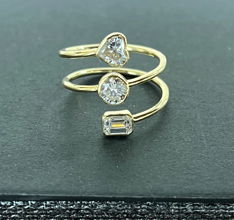 Expertly handcrafted in luminous 18K solid gold, this unique corkscrew-style ring features three dazzling natural diamonds in distinct cuts — Emerald, Heart, and Round — symbolizing elegance, love, and timeless beauty. The combination of geometric precision and romantic curves creates an eye-catching design that effortlessly transitions from day to evening wear.