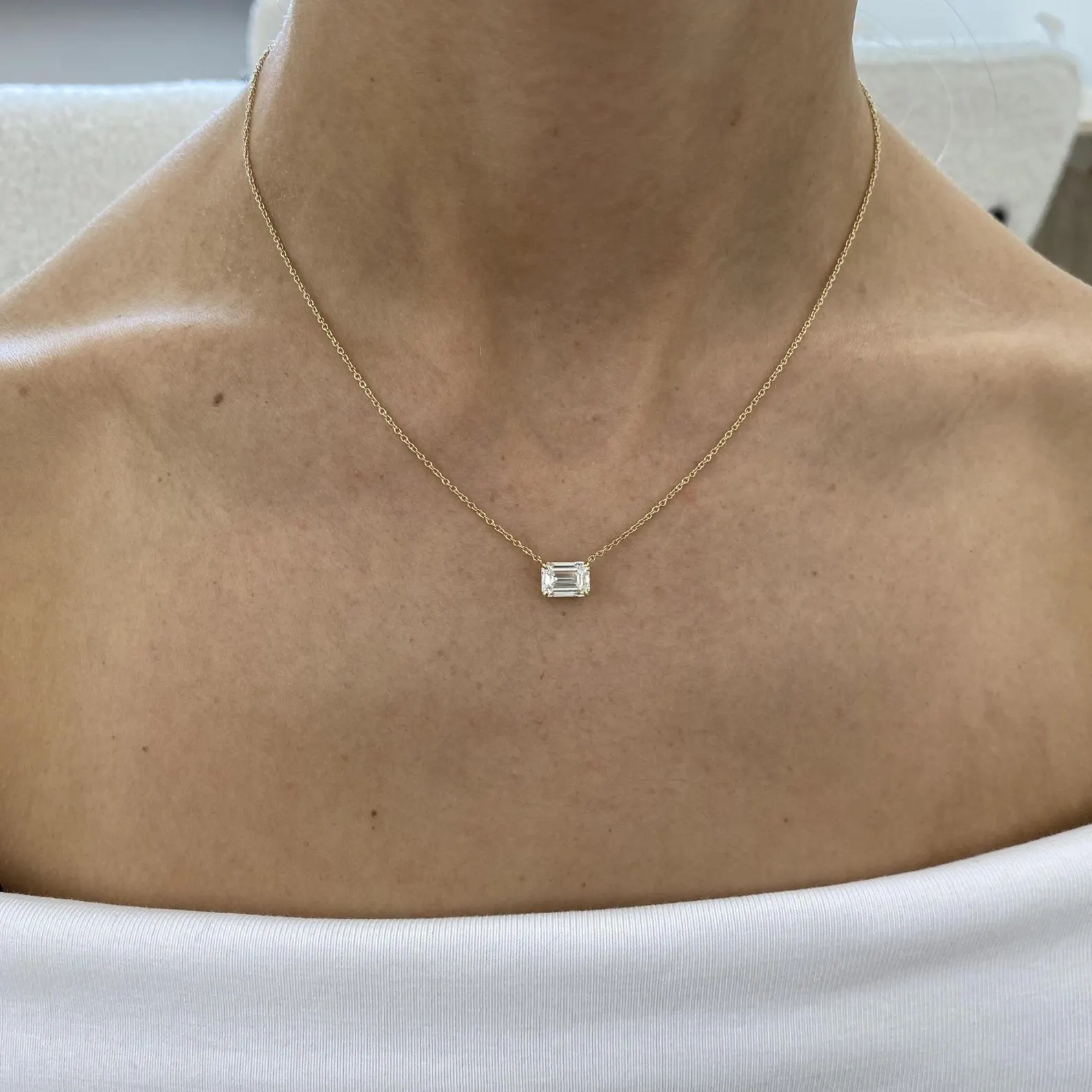 Experience refined brilliance with this 2 Carat Emerald Cut Lab Grown Diamond Pendant Necklace, crafted in luxurious 18K solid gold. The pendant features a striking emerald cut lab-grown diamond, known for its hall-of-mirrors effect and timeless silhouette.