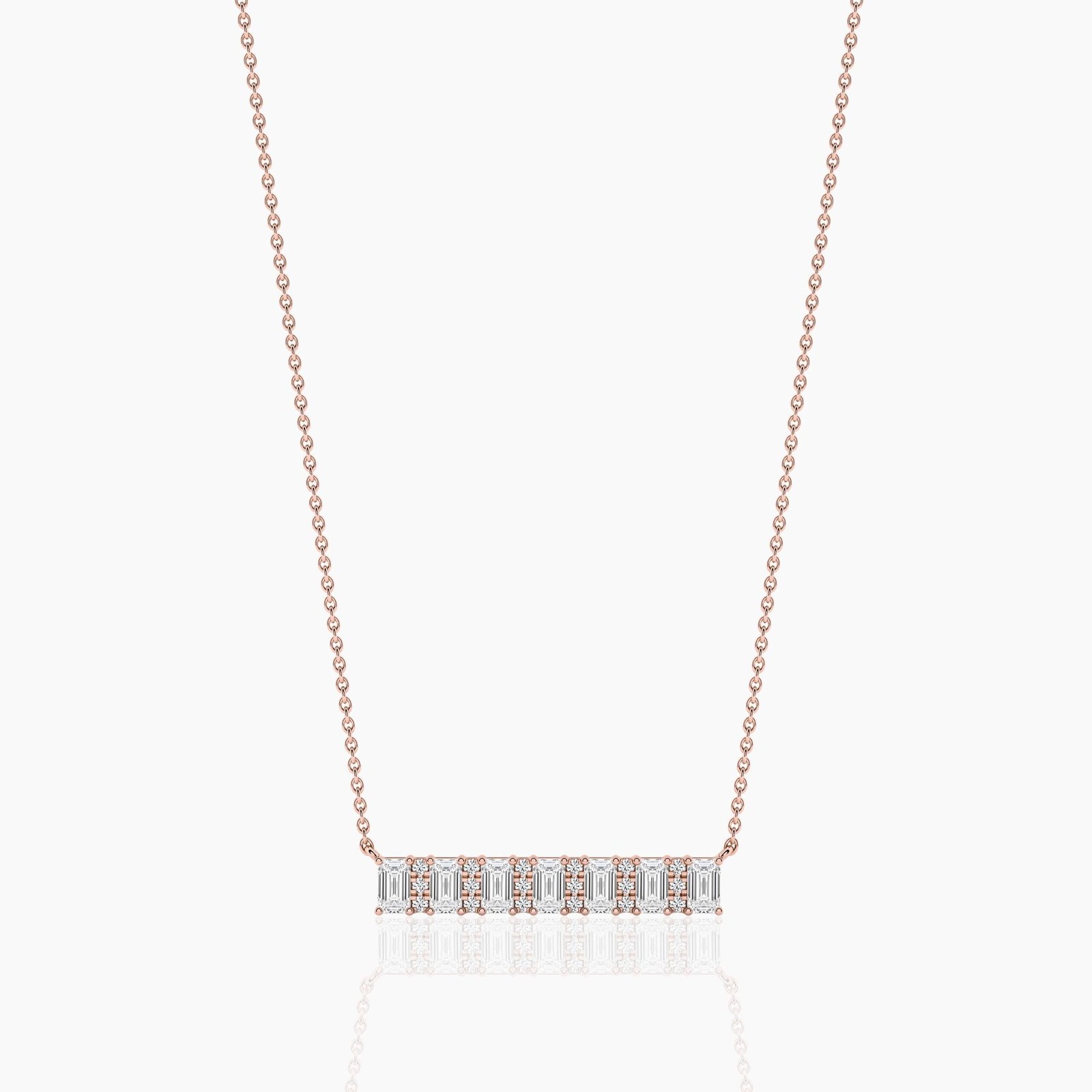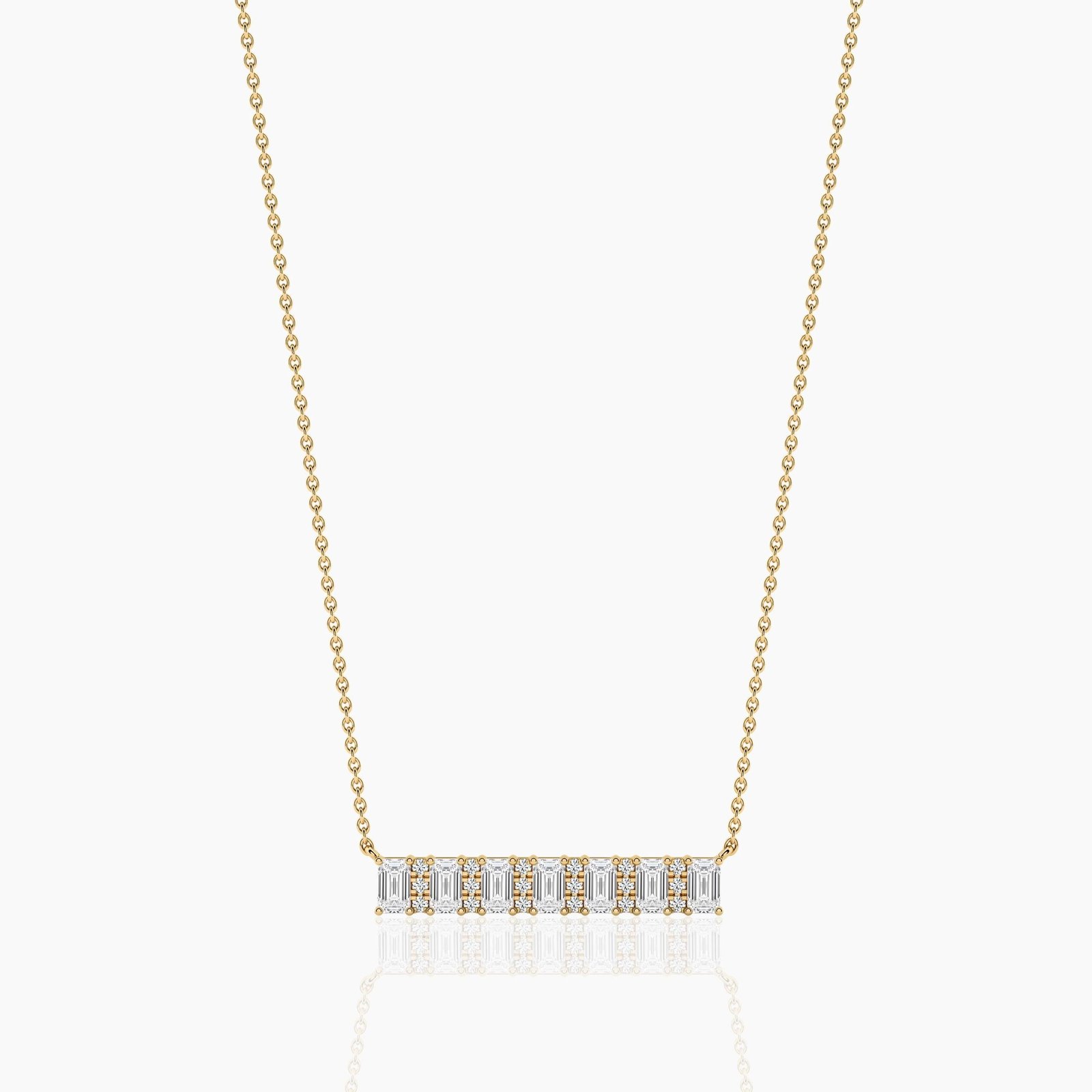 Make a bold yet refined statement with the 18K Solid Gold Emerald & Round Cut Natural Diamond Bar Necklace. This exquisite design features a perfect balance of elongated emerald-cut diamonds and brilliant round diamonds, meticulously aligned in a sleek horizontal bar setting.