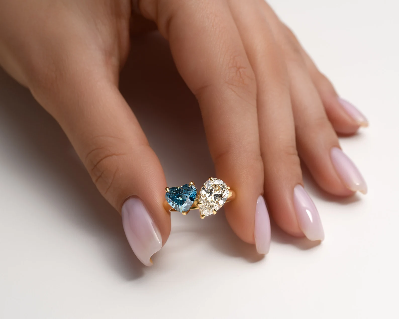 The centerpiece, a 1.81 Ctw heart-shaped blue diamond measuring 7.64 x 8.39 x 4.85 mm, radiates uniqueness and romance. Nestled beside it, a perfectly matched pear-cut white diamond enhances the symbolic duality of the Toi et Moi design — representing “you and me” in perfect harmony.