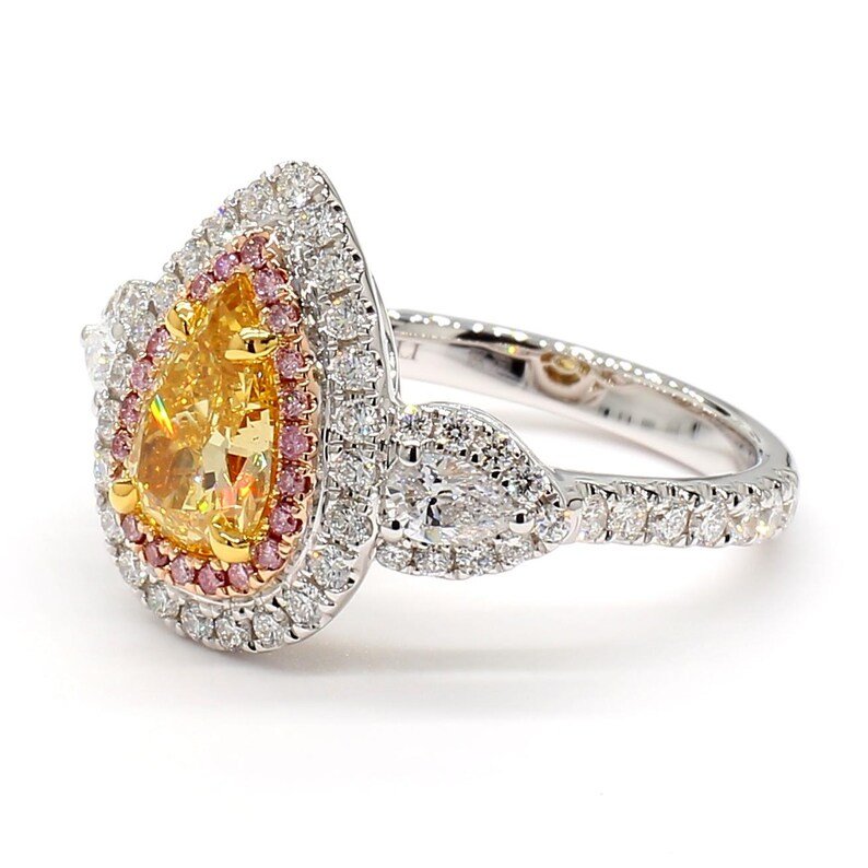 A radiant 18K gold cocktail ring featuring a 1.03ct fancy intense orangy yellow pear-cut diamond, accented with pink and white diamonds.