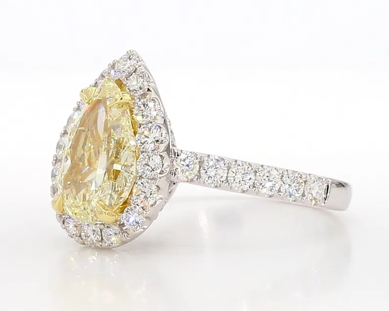 Make a bold and elegant statement with our 18K Solid Gold GIA Certified Natural Yellow Pear Diamond Cocktail Ring. This exquisite piece showcases a stunning 2.49 carat pear-cut light yellow diamond, lab-grown for sustainability and brilliance. Measuring 11.20 x 7.35 x 4.40 mm, the centerpiece radiates warmth and sophistication.