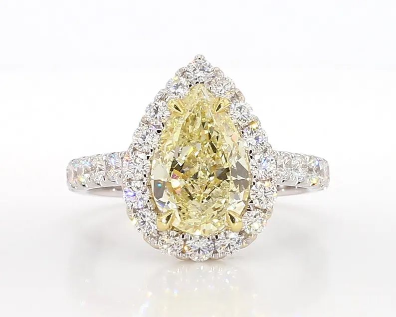 Exude opulence with this 18K solid gold cocktail ring featuring a 2.49ct pear-cut light yellow diamond, accented by brilliant round white diamonds. GIA certified.