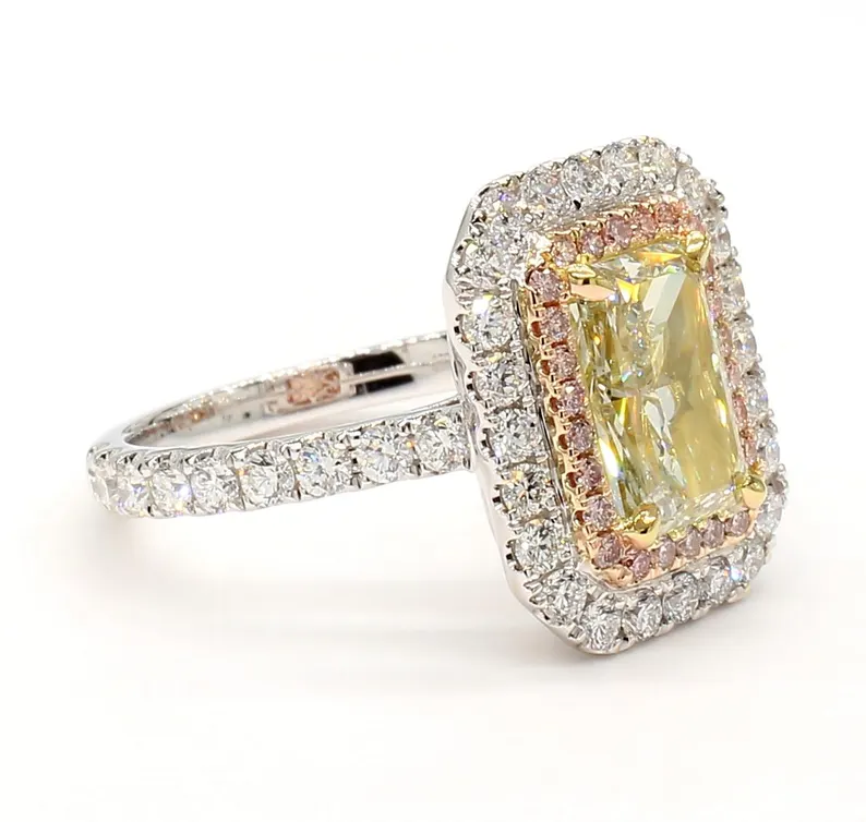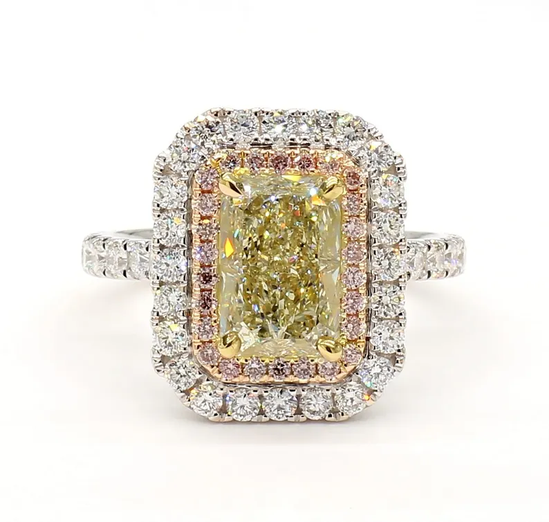 A distinctive 18K gold ring featuring a 0.64ct IGI-certified fancy green-yellow radiant lab-grown diamond, accented with pink, white, and baguette diamonds.