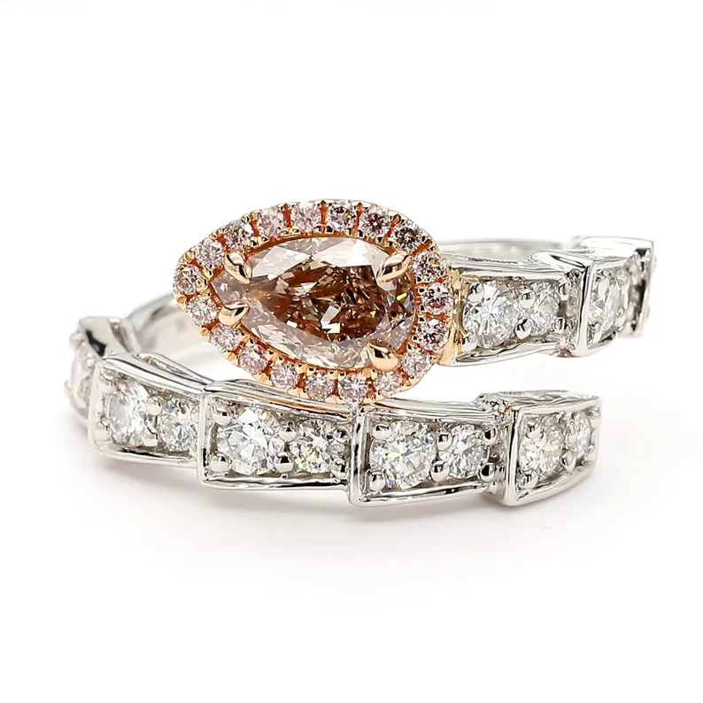 An elegant 18K gold cocktail ring featuring a 0.70ct pinkish brown pear-cut lab-grown diamond, adorned with pink and white diamond accents.