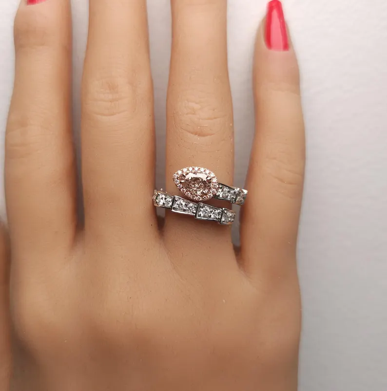 Celebrate modern romance and earthy elegance with our 18K Solid Gold Lab Grown Fancy Pinkish Brown Pear Diamond Cocktail Ring. The centerpiece features a 0.70 carat pear-cut lab-grown diamond with a rare and refined fancy pinkish brown hue, measuring 7.59 x 4.82 x 2.78 mm. Its unique color evokes a soft, feminine charm with a grounded, luxurious touch.