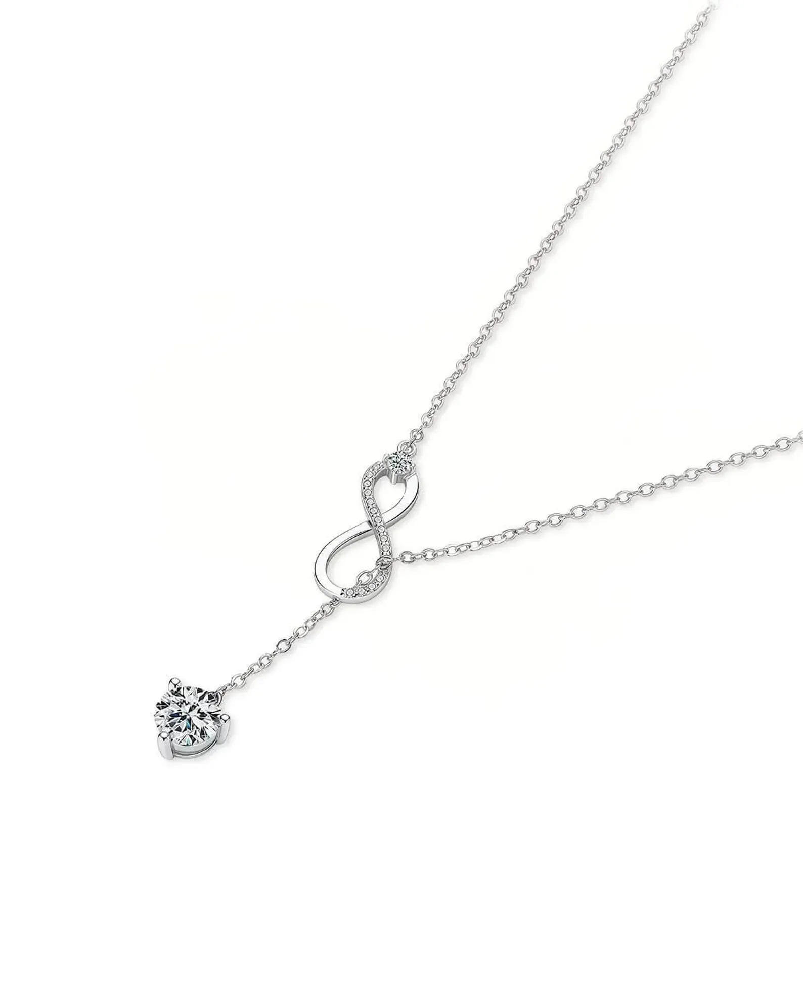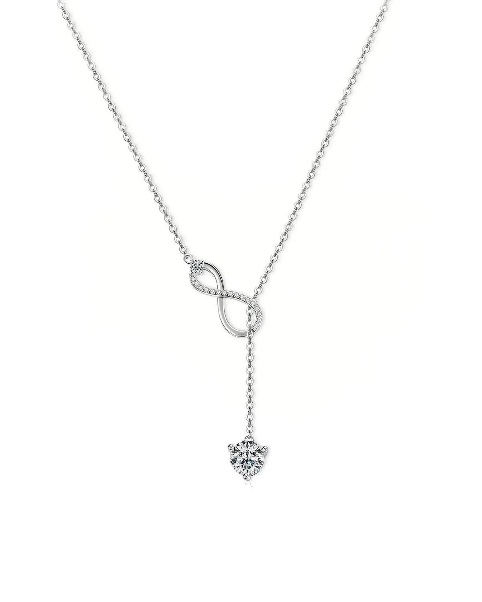 Expertly crafted in 18K solid gold, the round diamond of E color and VS1 clarity radiates brilliance and sophistication, perfectly balancing the elegant infinity design. Suspended from a long, refined chain, this necklace makes a stunning statement, ideal for both everyday elegance and special occasions.