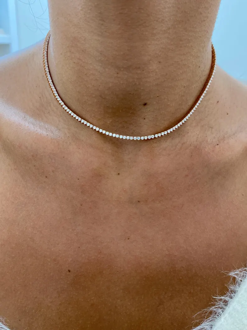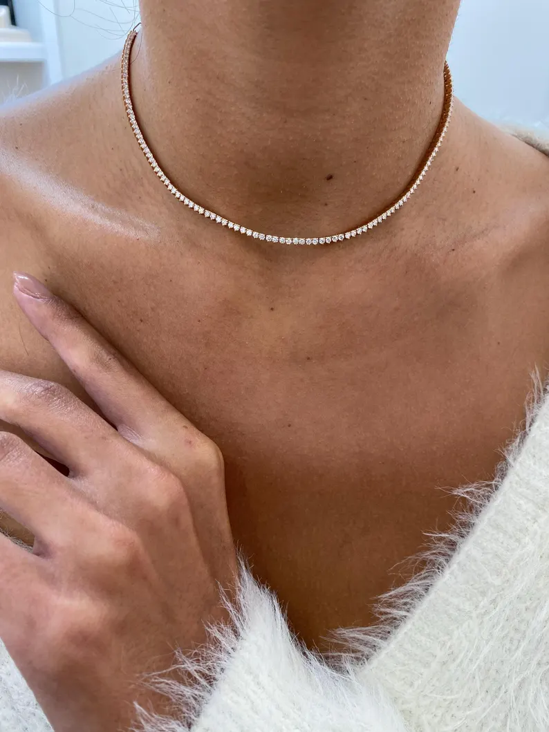 Grace your neckline with the sophisticated brilliance of our 18K Solid Gold Lab Diamond Tennis Necklace. Designed with elegance in mind, this classic piece features 2.57 carats of lab-grown diamonds, each meticulously set in a seamless row to create a radiant and timeless silhouette.