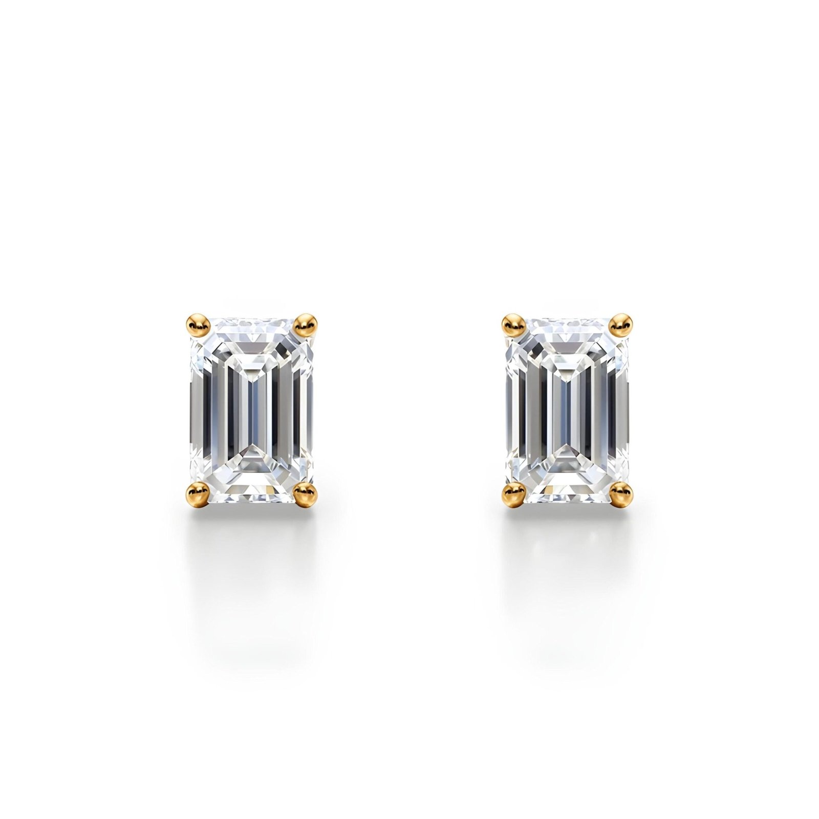 Elegant 18K gold stud earrings with 1 CT E color, VS1 clarity emerald-cut Lab Grown diamonds. IGI Certified for purity.