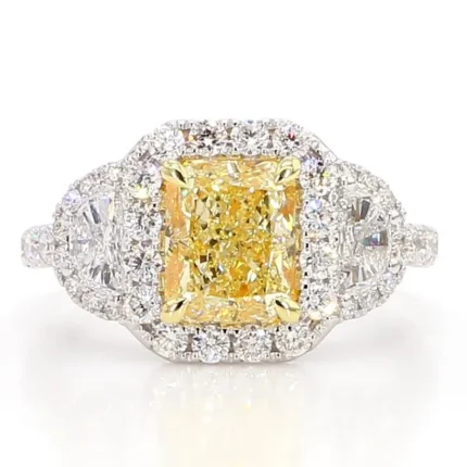 A stunning 3.21ct total weight cocktail ring in 18K solid gold, centered with a 2.06ct radiant-cut yellow lab grown diamond and flanked by half-moon and round white diamonds. Ethically crafted and IGI certified.