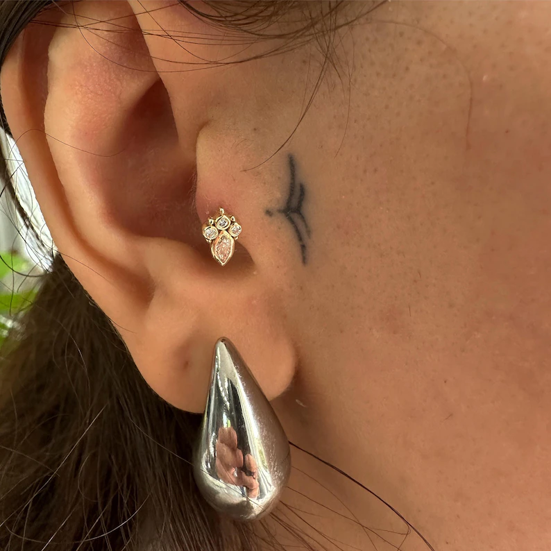 This 18K gold tragus & helix stud features 4 natural diamonds in marquise and round cuts (0.10 ct), bezel-set for modern, certified elegance.