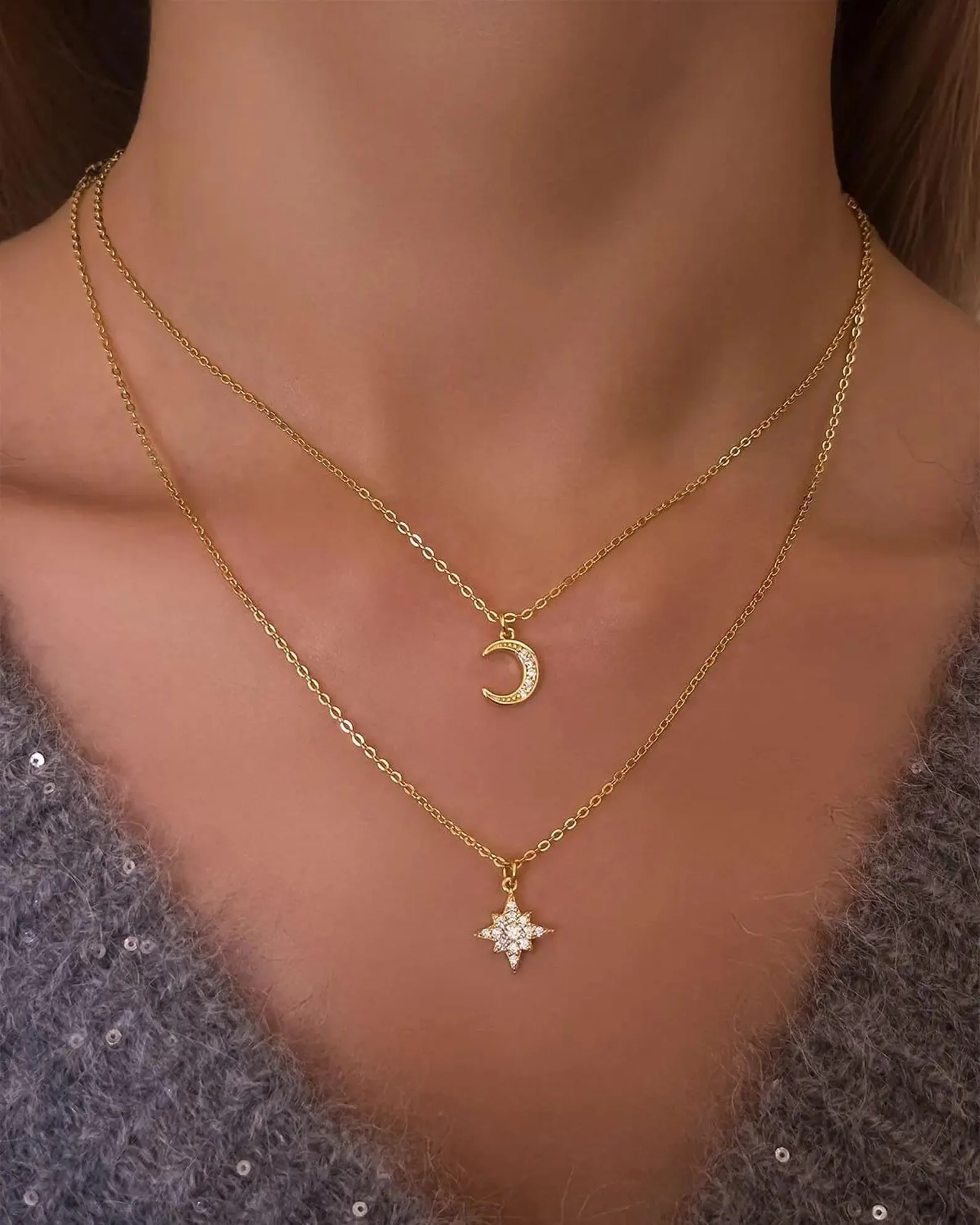 18K Solid Gold Moon and Star Double Chain Lab Grown Diamond Pendant Necklaces