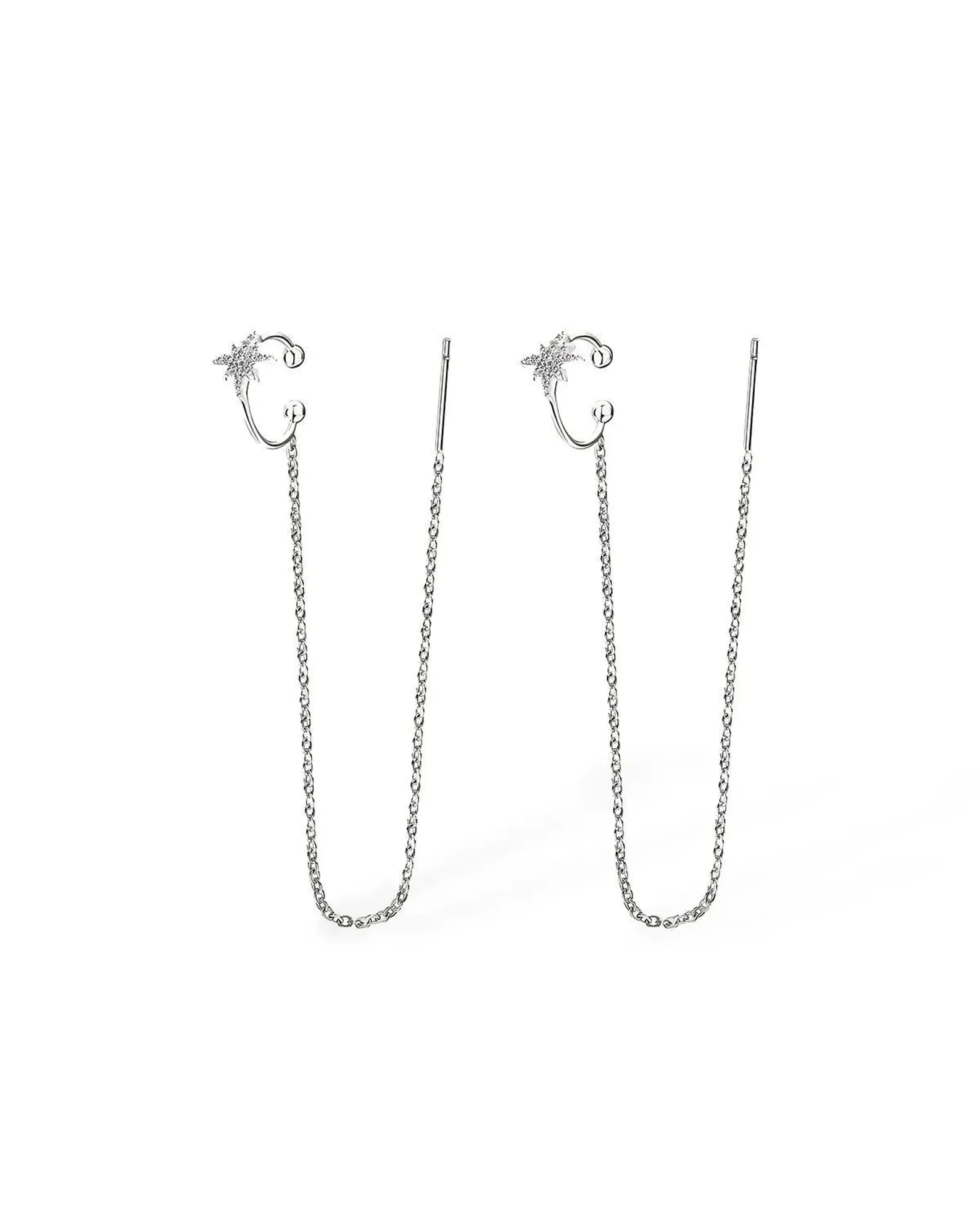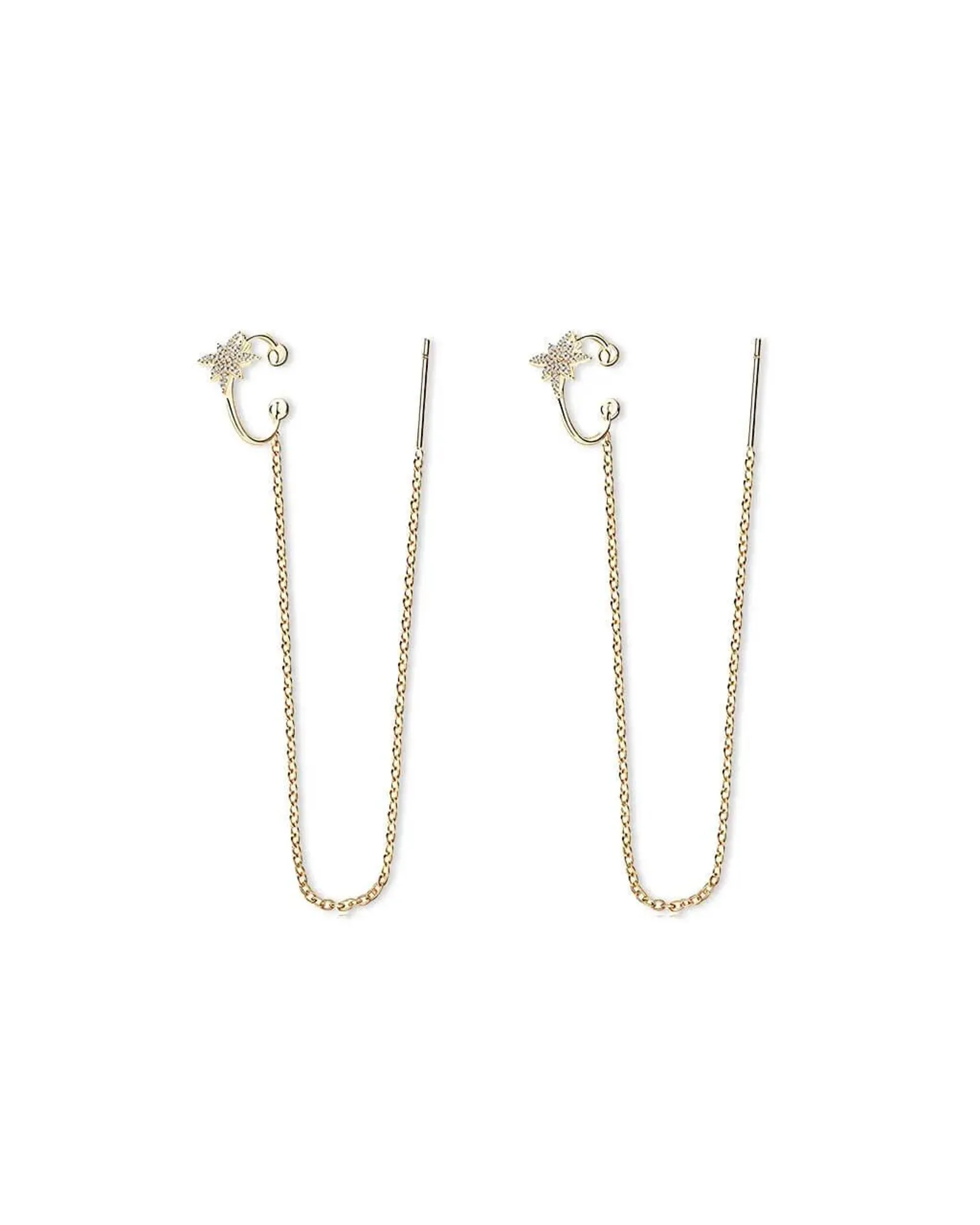 18K Solid Gold Natural Diamond Star Chain Cuff Earring | 18K Solid Gold Threader and Clip On Design