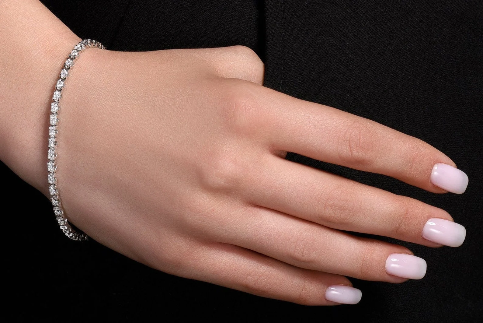 Each diamond is meticulously chosen for its E color, VS1 clarity, and excellent brilliance, measuring 2.5 mm in diameter and set securely in prong settings for maximum light reflection. The bracelet measures a standard 7 inches, offering a graceful fit that complements both formal and casual styles.