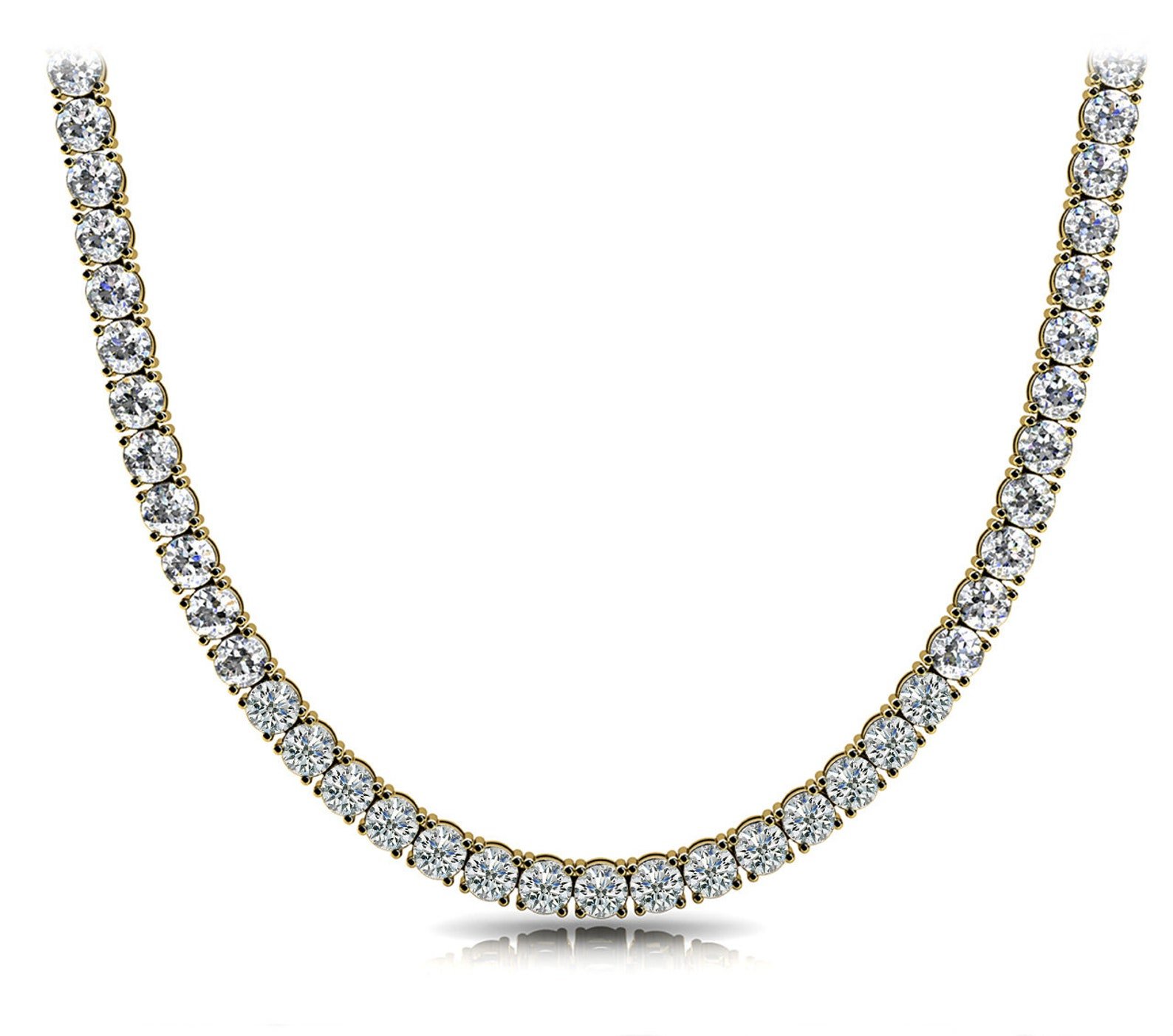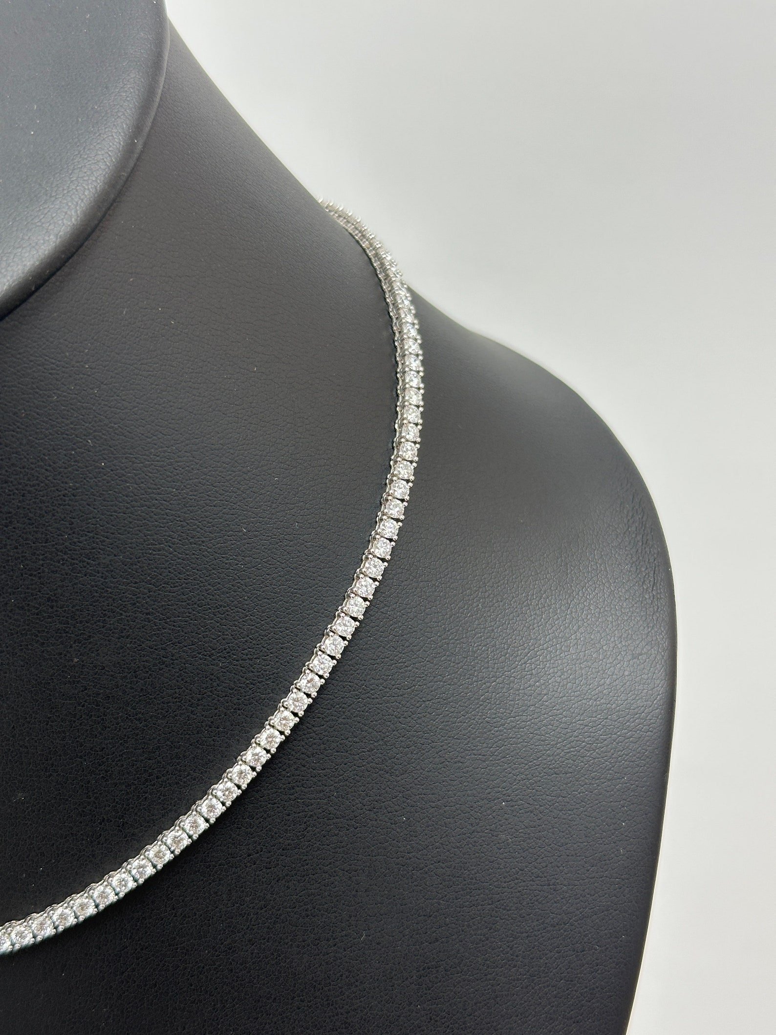 Elegant 18K solid gold tennis necklace with 5ct natural round diamonds. E VS1, IGI & BIS certified. Available in 16″, 17″, or 18″ lengths, custom sizes on request.