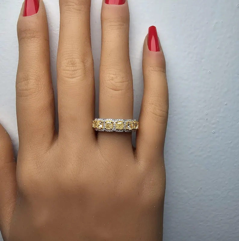 Turn heads with the brilliance of this 2.06 carat Cocktail Band, set in luxurious 18K Solid Gold. The ring features a captivating array of radiant cut Natural yellow diamonds, exuding vibrant warmth and energy. Accentuated by Natural round white diamonds, it creates a dazzling contrast that elevates any occasion.