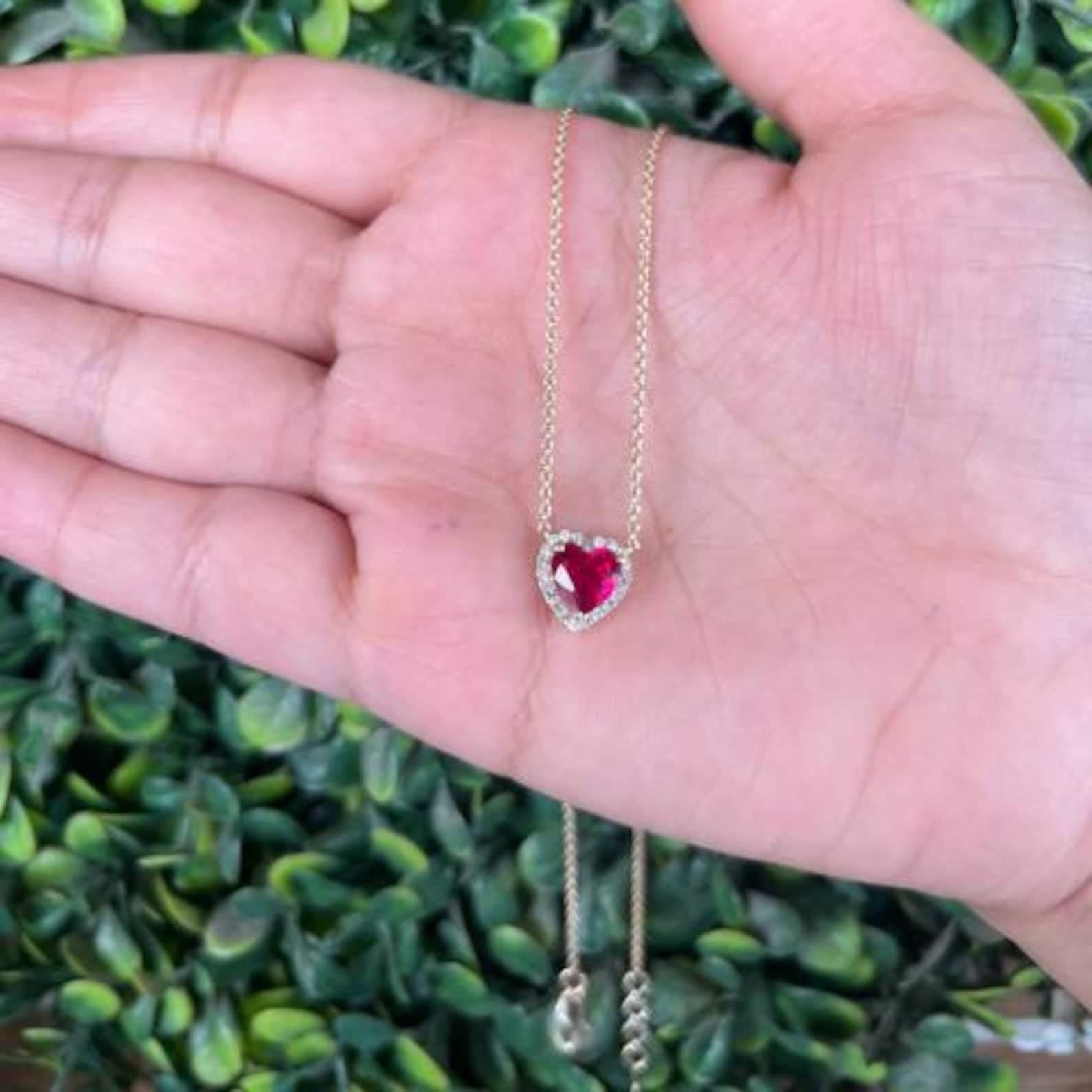 Celebrate elegance and romance with this exquisite 18K Solid Gold Ruby and Natural Diamond Halo Pendant Necklace. At its heart lies a richly hued heart-shaped ruby, encircled by a halo of brilliant round-cut natural diamonds, enhancing its deep red allure with dazzling sparkle.