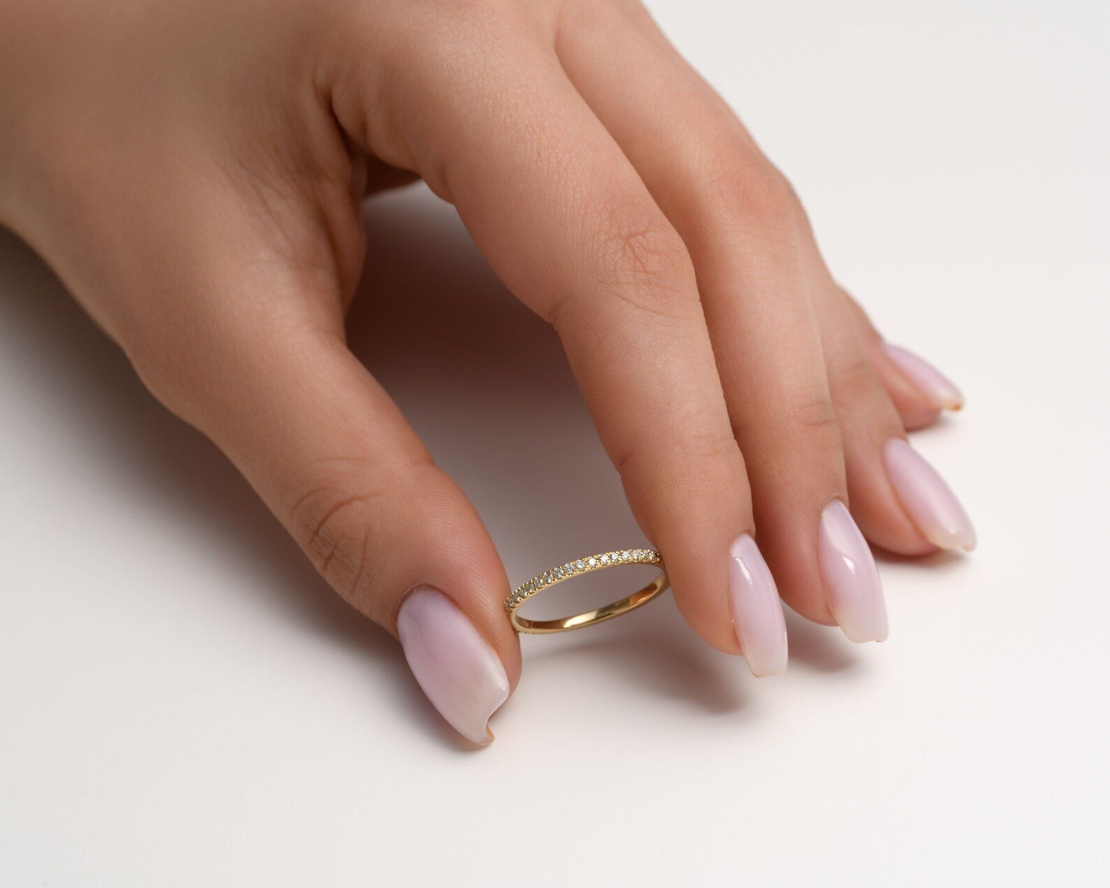 18K Solid Gold Skinny Thin Dainty Wedding Band With Paved Natural Diamonds