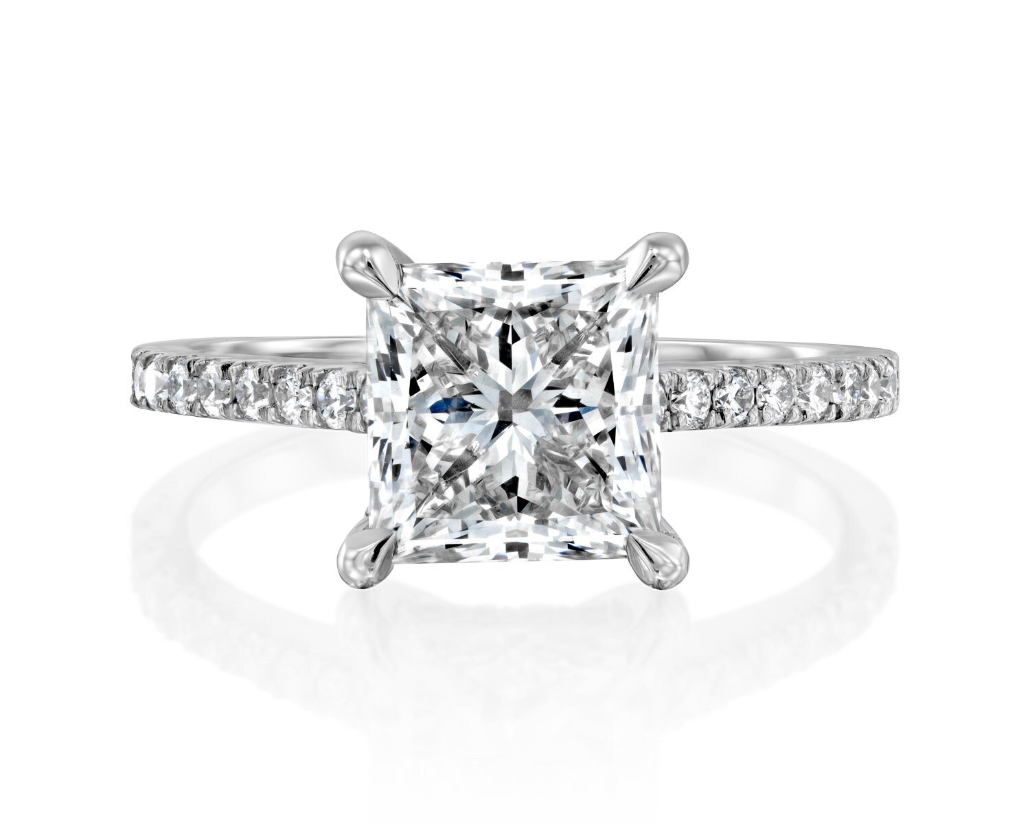 18K Solid Gold 2.5ct Princess Cut Natural Diamond Engagement Ring with Pave Band