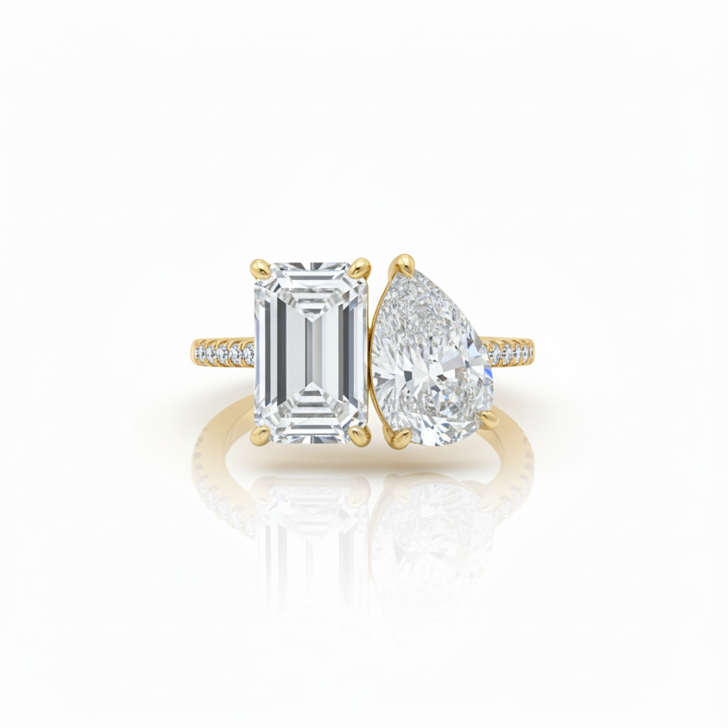The Radiant Pear Duo Romance 18K Lab Grown Diamond Toi et Moi Engagement Ring is a breathtaking expression of unity, contrast, and modern elegance. Expertly crafted in luminous 18K solid gold, this striking engagement ring pairs two iconic diamond cuts—an architectural radiant cut diamond and a softly luminous pear cut diamond—joined together in the classic toi et moi style to symbolize two distinct souls becoming one.