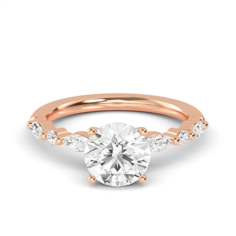 A timeless 18K Solid Gold Engagement Ring featuring a 1.00 ct round-cut natural diamond with round and marquise side stones, totaling 1.19 carats. Certified by GIA, H color, SI1 clarity.