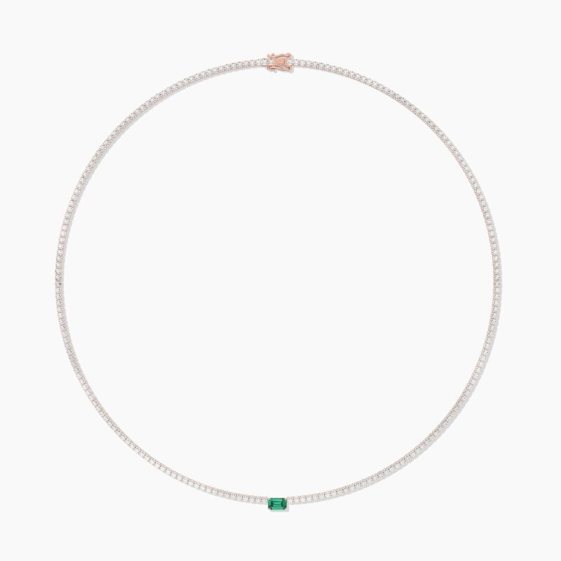 Flexible 18K gold choker necklace featuring a vibrant green emerald and a cascade of brilliant natural diamonds in a sleek, modern tennis setting.