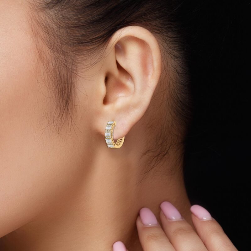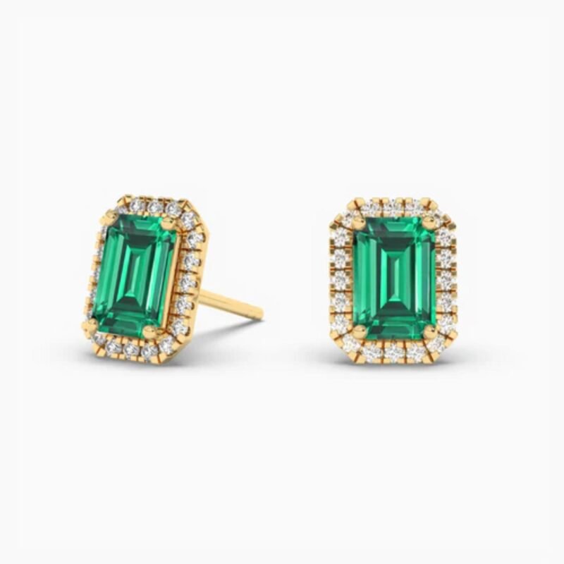 Classic emerald-cut natural diamond studs in 18K solid gold. Available in 0.50ct–2.00ct pairs. Certified, timeless elegance.