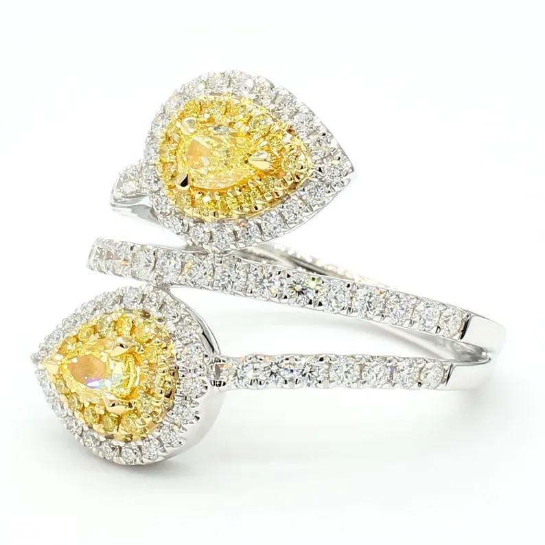 A stunning 1.16ct cocktail ring featuring pear and cushion-cut lab grown yellow diamonds in 18K solid gold, accented with brilliant round diamonds.
