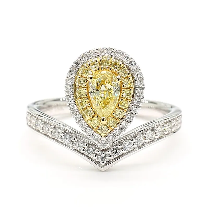 An exquisite 1.52 ct cocktail ring featuring a pear-cut lab grown yellow diamond surrounded by yellow and white diamond accents in 18K solid gold.