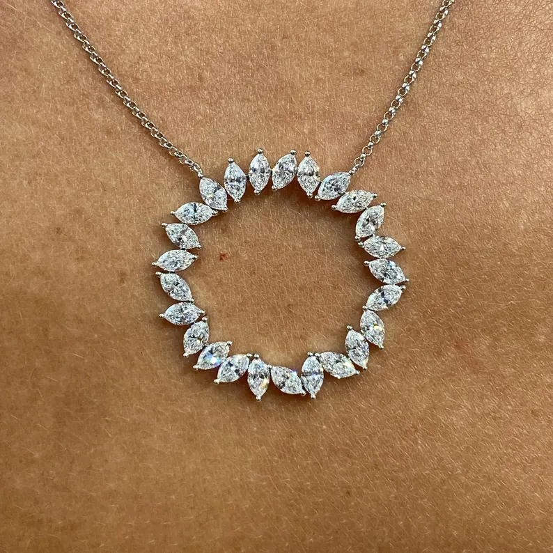 18K Solid Gold Marquise Lab Grown Diamond Round Cluster Pendant Necklace