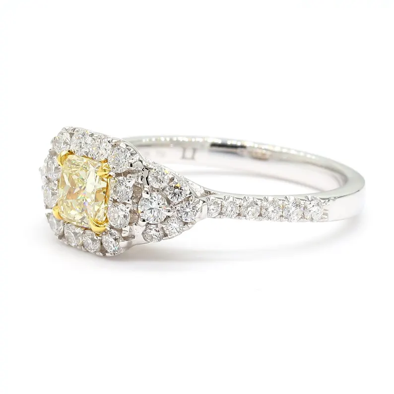 0.98ct radiant yellow diamond ring with round white diamonds in 18K gold. IGI certified. Elegant, ethical & timeless.